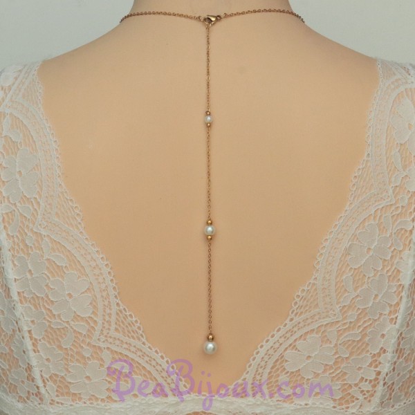 Mots-clés : bijou de dos, mariage, dos nu, perles blanches, billes dorées, doré, acier inoxydable, personnalisable, création artisanale
