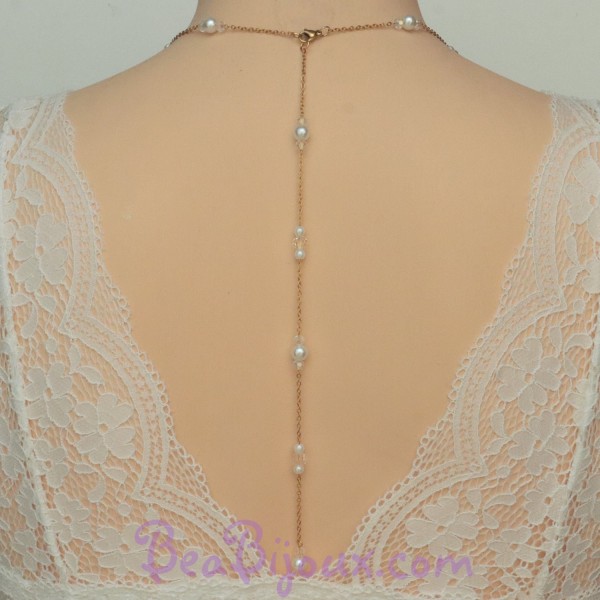 Mots-clés : bijou de dos, mariage, dos nu, perles nacrées, verre facetté, doré, acier inoxydable, fait main, créatrice bijoux