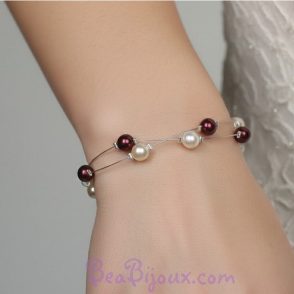Bracelet Mariage Double Rang : Perles Nacrées Ivoire et Bordeaux – BR1184A