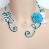 Matériaux : Fils d’aluminium blanc mat et turquoise, fleur en satin turquoise, feuilles blanches.