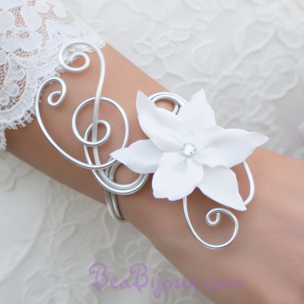 Mots-clés : bracelet mariage, bracelet mariée, bijou mariage, bracelet fleur satin, bracelet strass argent, accessoire mariage, bijou poignet cérémonie