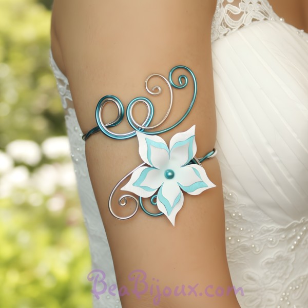 Mots-clés : bracelet brassard haut de bras, brassard aluminium argent turquoise, bracelet fleur satin, bijou mariage bras, bracelet festival bohème, bracelet artisanal femme, brassard sur mesure