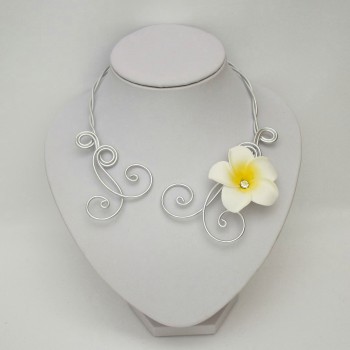 Mots-clés : collier mariée, fleur de tiaré, frangipanier, aluminium, fantaisie, original, tropical, bohème, champêtre, fait main, strass, personnalisable.