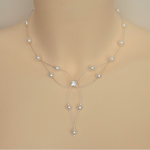 Composition : Perles de verre nacré blanc. Le pendentif est centré sur un strass brillant.