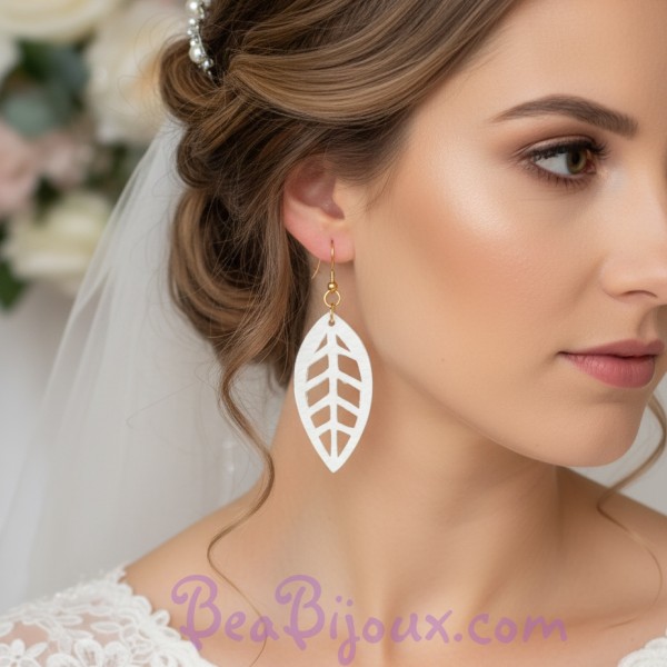 Mots-clés : boucles d'oreilles feuilles, simili cuir blanc, mariage bohème, nature, boucles d'oreilles pendantes, acier inoxydable, hypoallergénique, 6.5 cm, ajouré, fait main