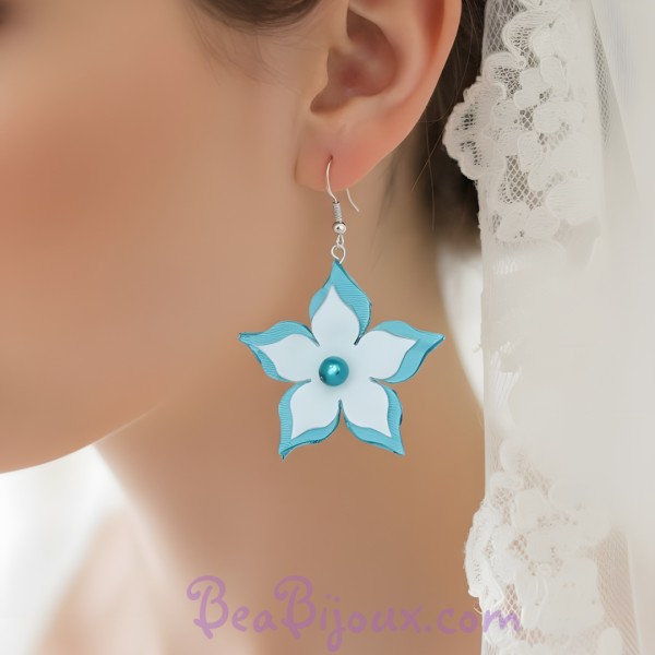 Mots-clés : boucles d'oreilles fleur, bleu turquoise, blanc, satin, boucles d'oreilles mariage, demoiselle d'honneur, acier inoxydable, hypoallergénique, perle, bijoux fantaisie, boucles d'oreilles 5.8 cm