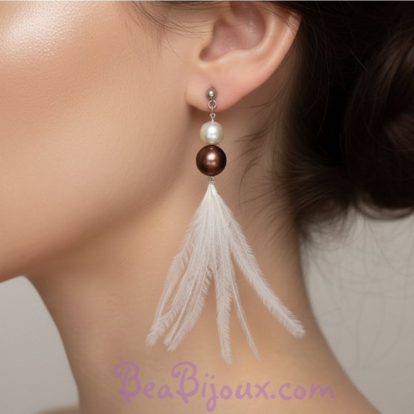 Boucles d'Oreilles Mariage Originales : Perles Ivoire, Chocolat et Plumes Crème