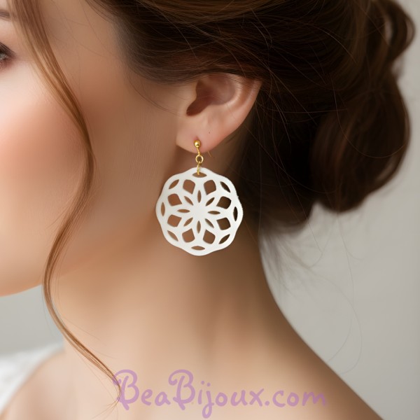 Motif Mandala Ajouré : Chaque boucle présente un magnifique motif mandala ajouré de 4,2 cm de diamètre, réalisé en simili cuir blanc (travaillé en recto-verso pour un rendu raffiné). Le motif crée un effet de dentelle moderne.
