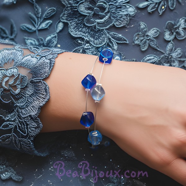 Élégant bracelet fantaisie à 2 rangs composé de perles en verre transparent bleu clair et bleu foncé, aux reflets semi-irisés et à la forme cubique originale.