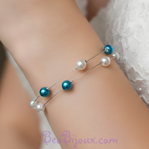 Mots-clés : bracelet mariage ivoire turquoise, bracelet 2 rangs perles nacrées, bijou mariage marin, bracelet mariée chic, bracelet mariage original
