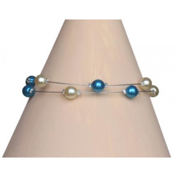 Bracelet de mariage à deux rangs en perles de verre nacrées ivoire et bleu turquoise. L’association délicate de l’ivoire élégant et du turquoise lumineux apporte fraîcheur et originalité à votre tenue.