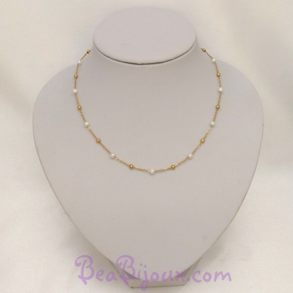 Perles et Billes : Le collier est orné d'une succession de perles en verre nacré blanc et de billes en acier inoxydable doré, créant un motif graphique et lumineux tout autour du cou.