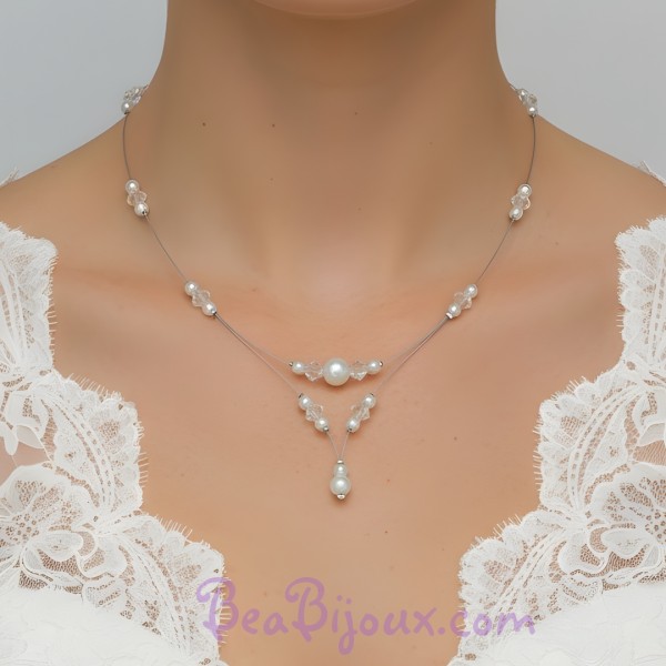Collier de mariage élégant et fin, composé de perles nacrées blanches et de perles en cristal transparent.