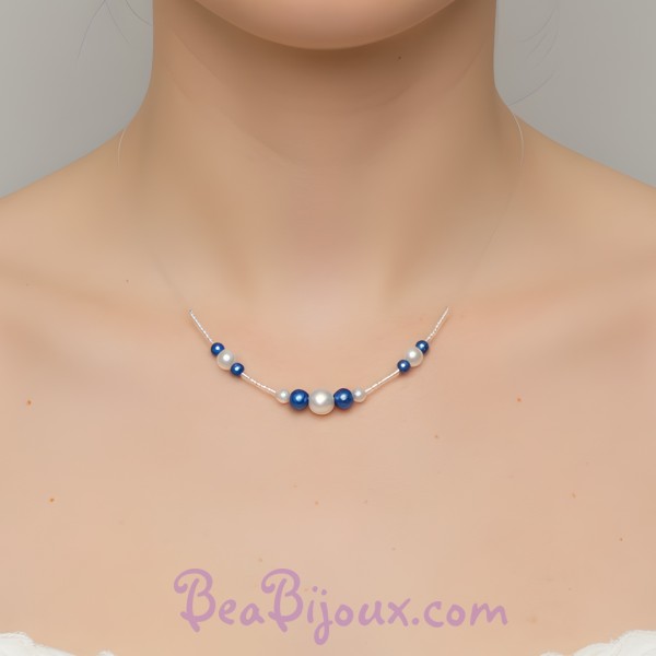 Mots-clés : collier perles nacrées, collier mariage, collier bleu royal, bijou cérémonie, collier nylon transparent, collier perles personnalisable, bijou élégant femme, blanc et bleu., demoiselle d'honneur.