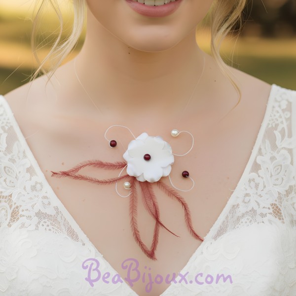 Collier mariage fleur plumes ivoire clair bordeaux CO4291A