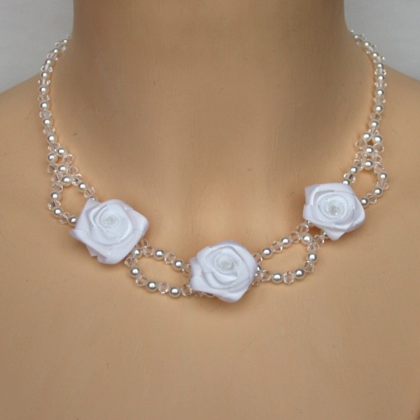 Collier Fleuri Champêtre Perles, Cristal et Roses Blanches – Modèle CO4275A