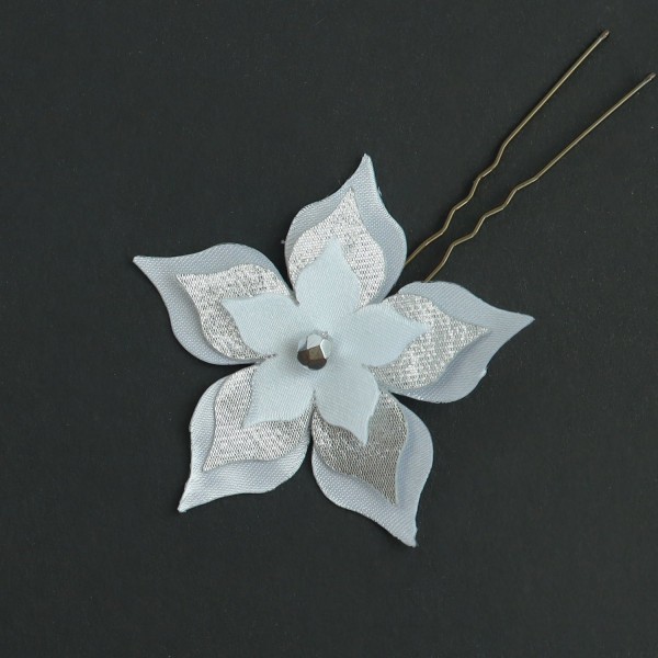 Épingle Cheveux Mariage Fleur Satin Blanc, Lamé Argent et Perle Facettée (6,3 cm)