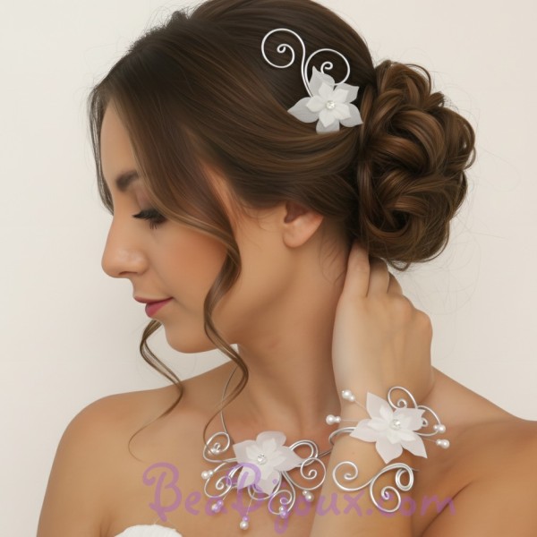 Mots-clés : parure, mariage, aluminium, fleur, soie, blanc, perles
